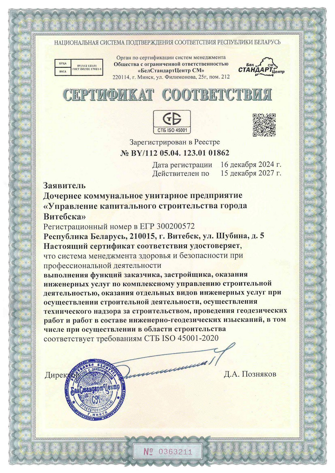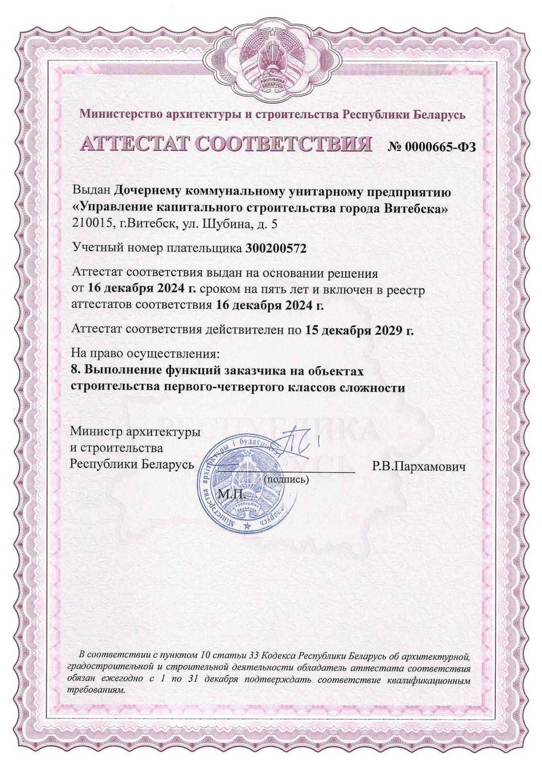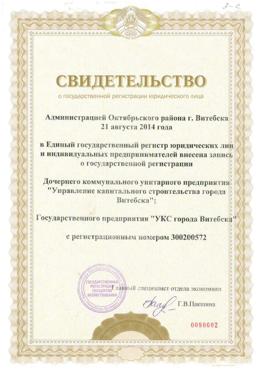 Будучи государственным предприятием, УКС города Витебска имеет все необходимые атрибуты юридического лица: самостоятельный баланс, расчетные и иные счета, печати с изображением Государственного герба Республики Беларусь и со своим наименованием, фирменные бланки, угловые штампы и зарегистрированный товарный знак. Всё это подтверждает официальный статус организации и гарантирует партнерам и дольщикам полную юридическую защищенность.